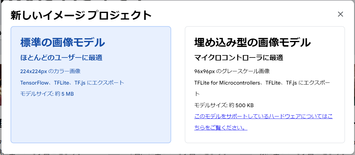 新しい「画像プロジェクト」を選び、「標準の画像モデル」を選びましょう
