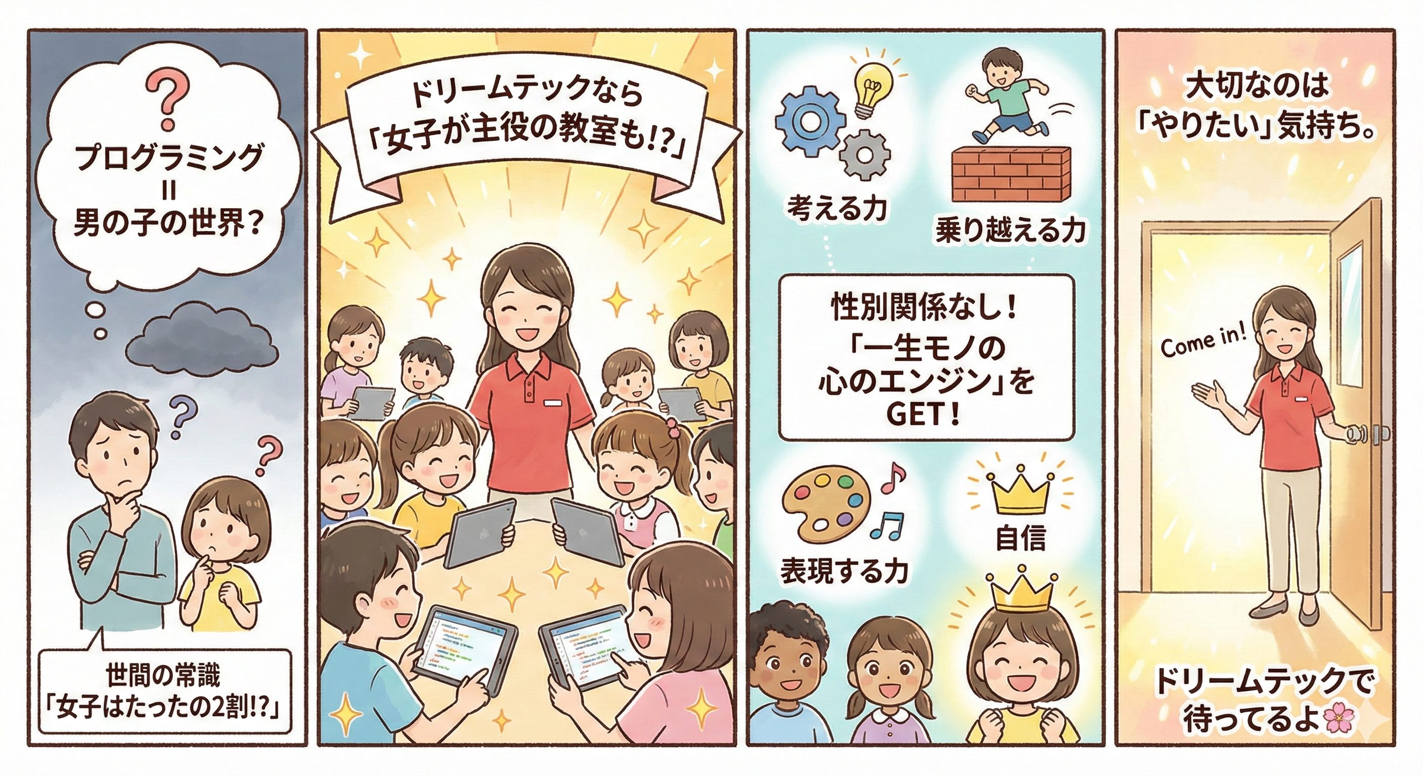 あえてこの数字を出したのは、プログラミングは 性別に関係なく誰もが主役になれる、キラキラした世界が広がっているんだということを、もっと多くの親子に知ってほしかったからです。