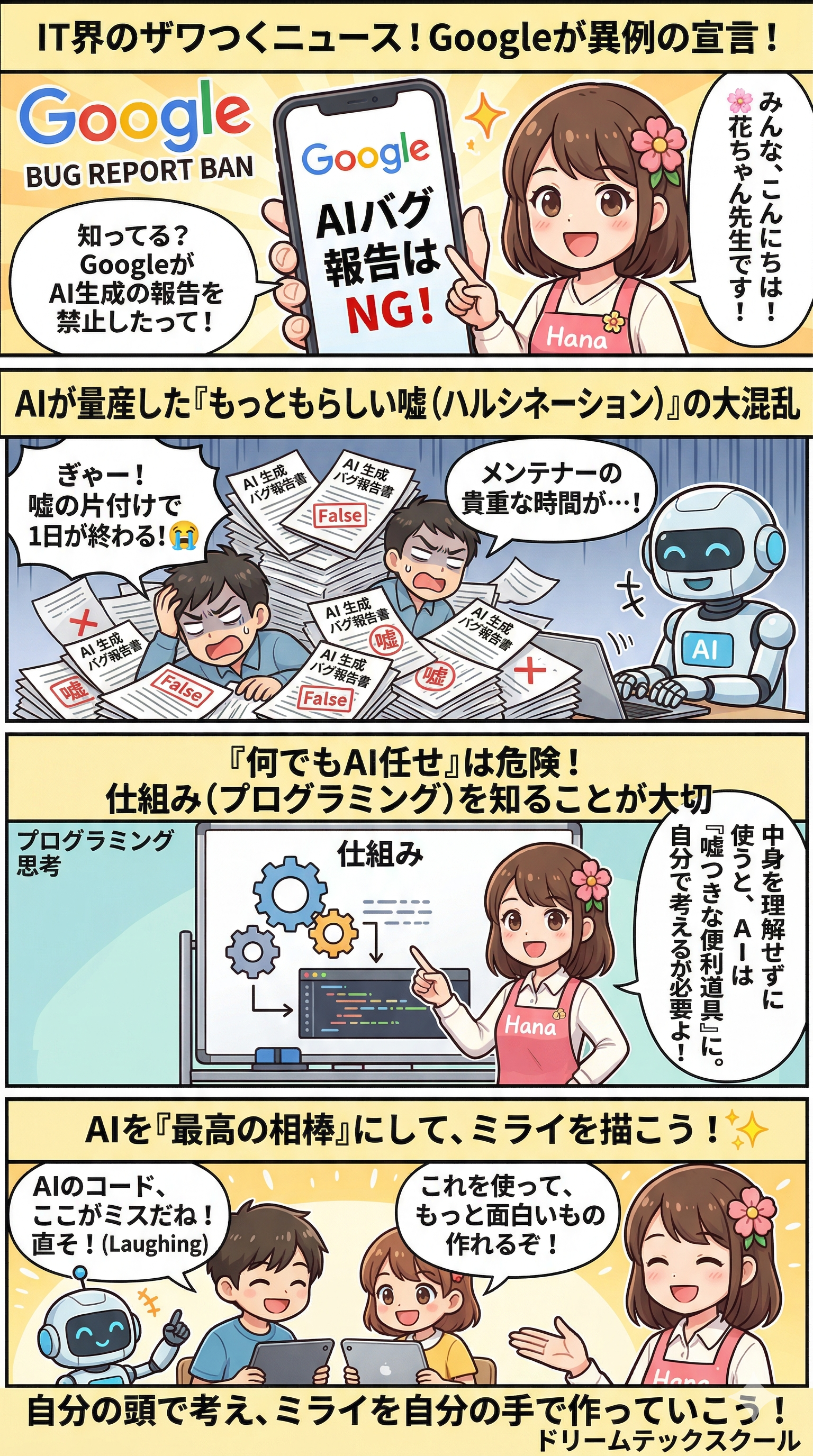 あの世界一の検索エンジン・Googleが、「AIが書いたバグ報告書は、もう受け付けません!」と、異例の宣言をしたんです。
